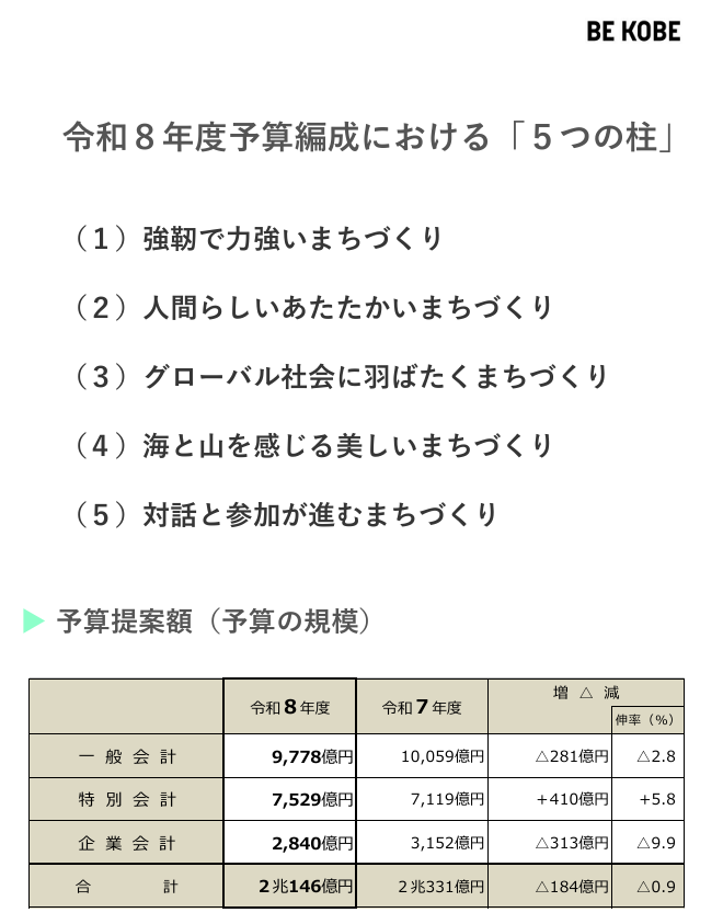 2026年2月17日 / 最終更新日 : 2026年2月17日 news 活動情報 令和8年第1回定例市会が開催されました。 【神戸市会】 2月17日~5月26日の期間となります。 2月25日に予算特別委員会が設置され令和8年度予算が審議されます。 神戸市 令和8年度予算案 全会計 2兆146億円 一般会計 9,778億円 特別会計 7,529億円 企業会計 2,840億円 Facebooktwitter