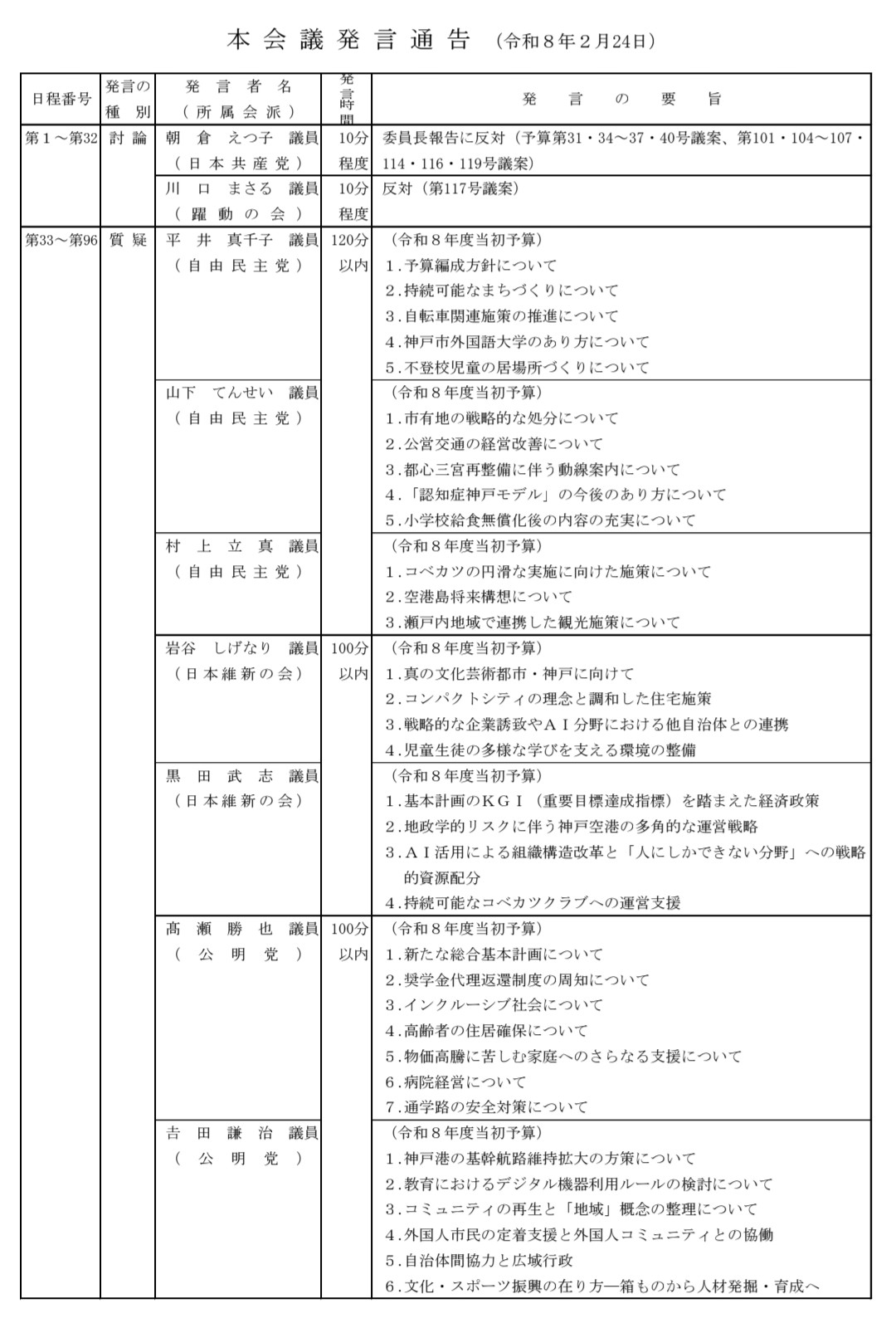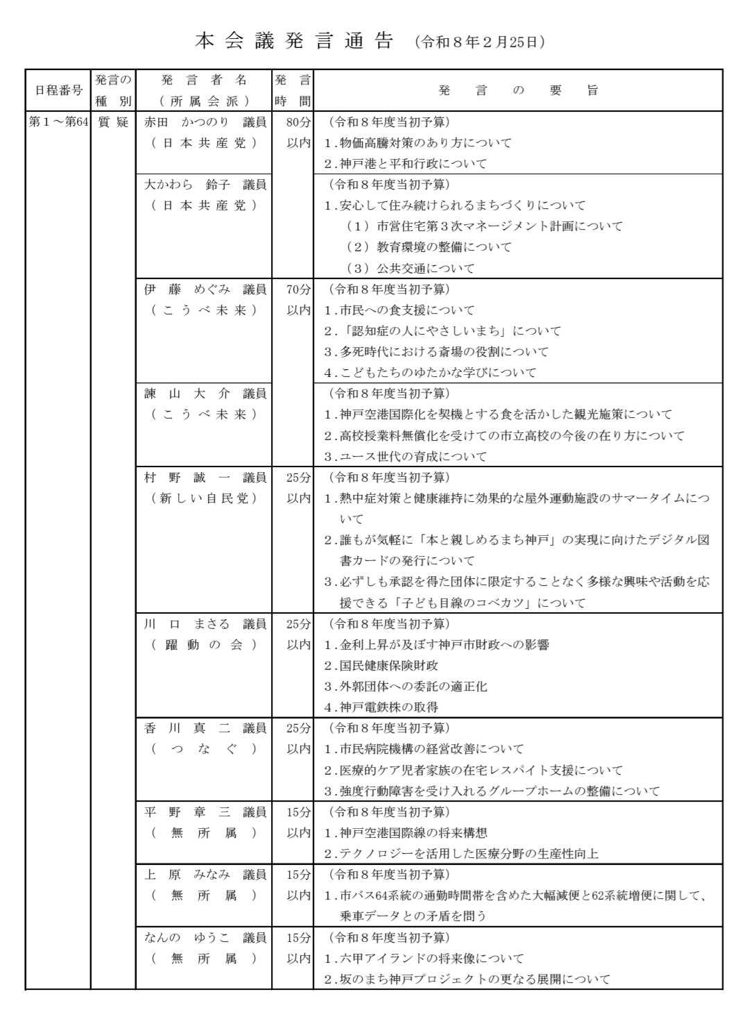 神戸市会では、昨日と今日で各会派から令和8年度当初予算案への代表質疑が行われました。