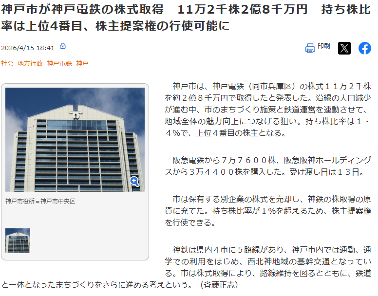 神戸市は、神戸電鉄の株式11万2千株を約2億8千万円で取得したと発表があり、マスコミでも報道されております。